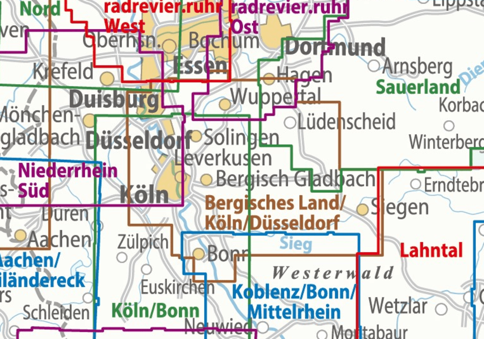 Radeln im Bergischen Land. Die Fahrradkarte umfasst das Gebiet von Düsseldorf, Wuppertal, Hagen, Solingen, Remschein, Lüdenscheid, Plettenberg, Leverkusen, Köln, Bergisch Gladbach, Bonn, Siegburg, Gummersbach, Olpe und Siegen, mit Rhein, Sieg, Wupper, Wipper und Bigge.